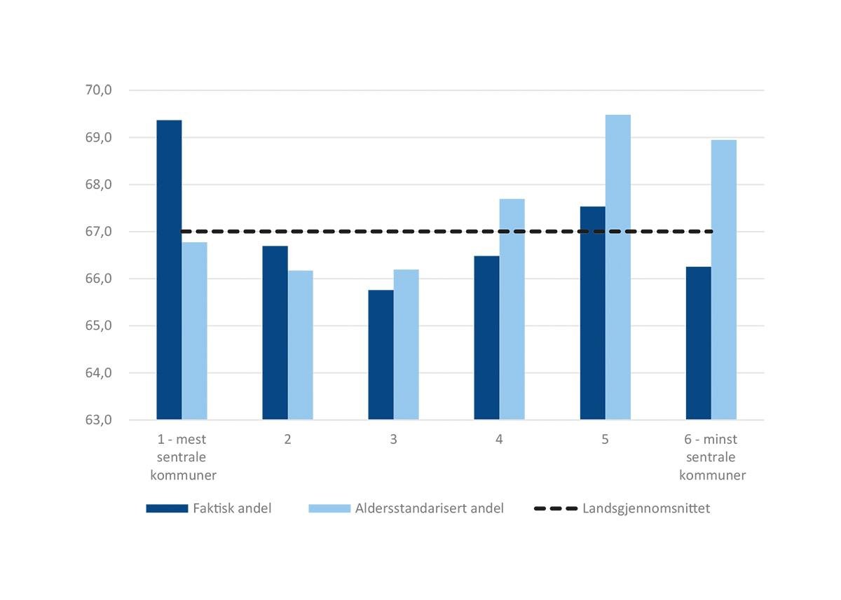Figur 5.6 Faktisk og aldersstandardisert* sysselsettingsandel etter sentralitet, 2019. Tall i prosent av befolkningen (15–74 år).