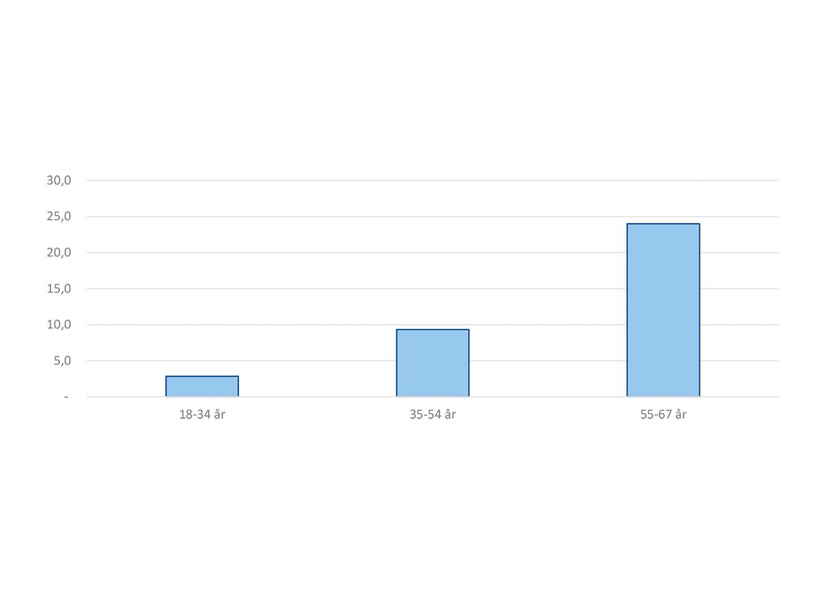 På samme måte som for sysselsettingsandelen varierer forekomsten av uføretrygd med alder. Figur 5.9 viser andelen uføretrygdmottakere av befolkningen i aldersgruppene 18–34 år, 35–54 år og 55 år og over per desember 2019. Andelen som mottar uføretrygd øker betydelig med alder og i aldersgruppen 55–67 år mottar 24 prosent uføretrygd.