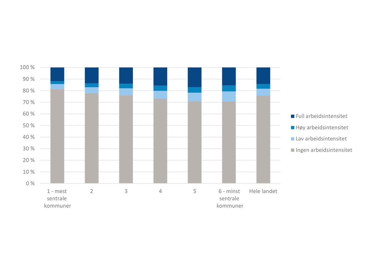 Figur 5.12 Arbeidsintensitet blant uføretrygdmottakere etter sentralitet 2019. Tall i prosent av totalt antall uføretrygdmottakere per intensitetsnivå.