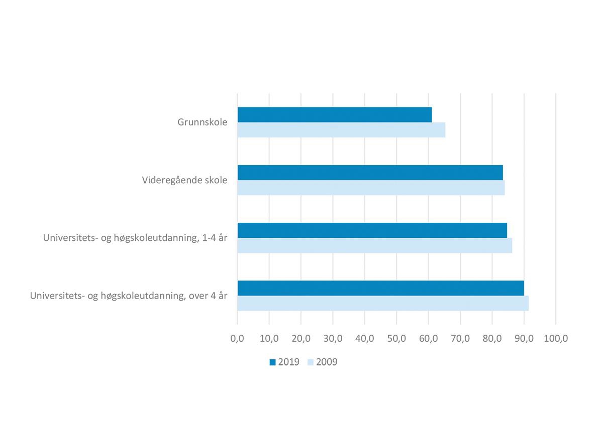 Selv om Norge har en relativt høy sysselsettingsandel sammenlignet med andre land, har vi også etter samme målestokk en høy andel mottakere av uføretrygd16 og andre helserelaterte ytelser. Det bidrar til at mange i arbeidsdyktig alder står utenfor arbeidslivet. Svak helse er dermed ofte koblet til manglende deltakelse i arbeidsmarkedet. Perspektivmeldingen 2021 viser videre til at over tid er svak kobling til arbeidsmarkedet nært knyttet til å leve med vedvarende lavinntekt, særlig for personer i yrkesaktiv alder. Vi vet videre at manglende formell kompetanse og ikke fullført videregående utdanning gir store utfordringer med å komme i arbeid, og personer med lite formell utdanning og manglende kvalifikasjoner er overrepresentert blant arbeidsledige og uføre. Det er også nær sammenheng mellom en persons utdanningsnivå og lavinntektsrisiko. Personer som har utdanning på grunnskolenivå eller lavere er sterkt overrepresentert i lavinntektsstatistikken, sammenlignet med personer som har fullført videregående opplæring.