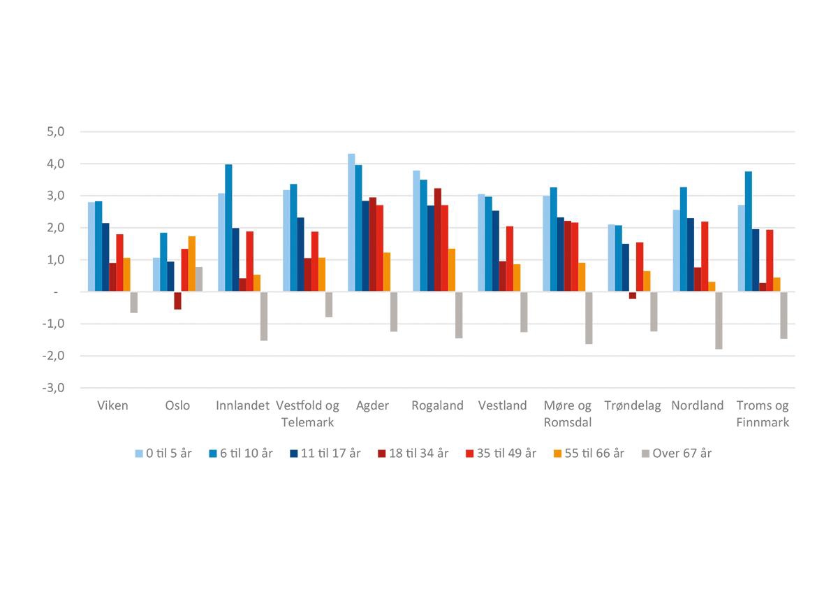 Fylker | 0–5 år | 6–10 år | 11–17 år | 18–34 år | 35–49 år | 50–66 år | Over 67 år |