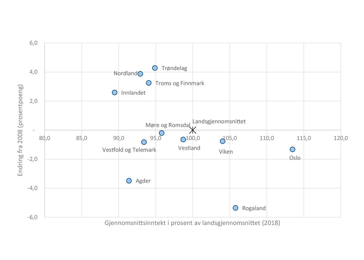Over tid har forskjellene i gjennomsnittsinntekt mellom fylkene blitt mindre. Figur 5.22 viser fylkenes gjennomsnittsinntekt i prosent av landsgjennomsnittet i 2018 på den horisontale aksen og hvordan dette har endret seg mellom 2008 og 2018 på den vertikale aksen. Det siste tiåret har mange av fylkene med lavere gjennomsnittsinntekt – Innlandet, Trøndelag, Nordland og Troms og Finnmark – nærmet seg landsgjennomsnittet. Samtidig har fylker med høyere gjennomsnittsinntekt – Viken, Rogaland og Oslo – hatt en motsatt utvikling. De andre fylkene under landsgjennomsnittet hadde en tilsvarende negativ utvikling, men samlet sett har inntektsnivået mellom landets fylker altså nærmet seg hverandre.