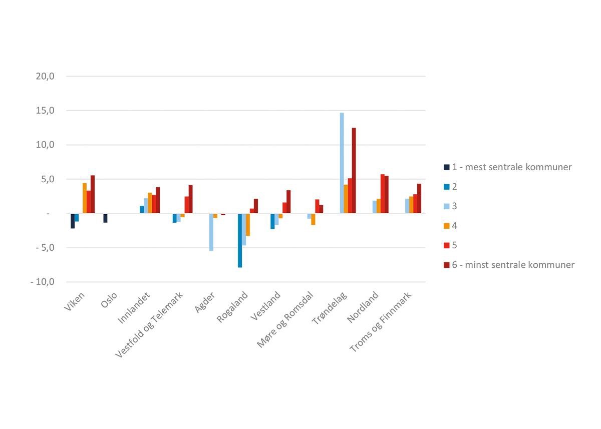 Når vi ser på hvordan utviklingen har vært etter sentralitet, er det særlig i de minst sentrale kommunene at inntekten har nærmet seg landsgjennomsnittet sammenlignet med 2008, mens det motsatte er tilfellet for de mer sentrale kommunene, og da særlig på Sør- og Vestlandet, jf. figur 5.23.