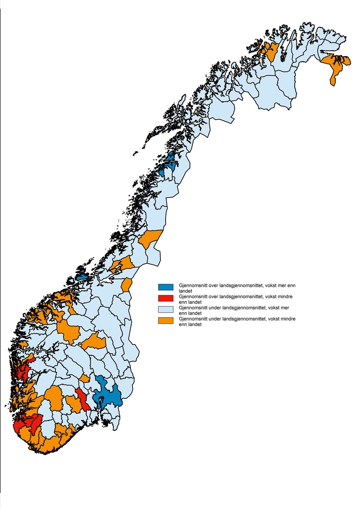Utviklingen etter 2014 viser derimot at forskjellene mellom fylkene har økt noe. Igjen bidrar de regionale effektene av oljeprisfallet til å forklare dette, ved at spesielt Rogaland, men også de andre fylkene på Sør- og Vestlandet, fikk en negativ utvikling. Samtidig hadde resterende fylker, inkludert høyinntektsfylkene Viken og Oslo, en positiv utvikling i samme periode. Dette gjorde at forskjellene mellom fylkene var større i 2018 sammenlignet med 2014. Dette illustreres i figur 5.24, der vi ser på hvilke BA-regioner som hadde gjennomsnittsinntekt over landsgjennomsnittet i 2018, og hvordan utviklingen sett opp mot landsgjennomsnittet har vært siden 2014. Røde og oransje BA-regioner har hatt en negativ utvikling, og brorparten av dem er konsentrert langs kysten fra Agder opp til Møre og Romsdal. Denne endringen finner vi også for lavinntektsandelen. Siden 2011–2013 er det særlig i Agder og Rogaland som lavinntektsandelen har økt betraktelig.