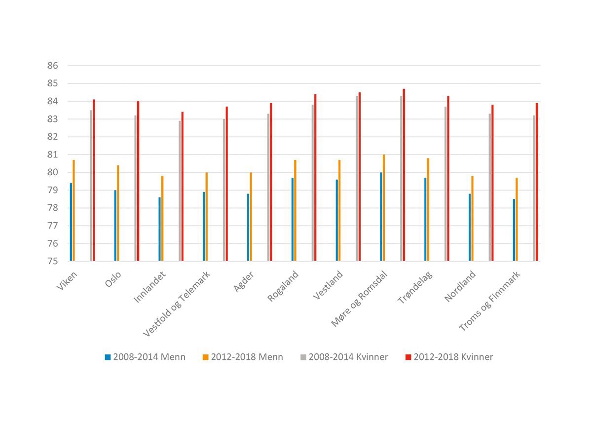 Siden slutten av 1990-tallet har Oslo og Troms og Finnmark hatt den sterkeste veksten i forventet levealder på henholdsvis 3,4 og 2,8 år, mens Vestland (1,6 år), Møre og Romsdal (1,9 år) og Nordland (2 år) har hatt den svakeste veksten. Den samme trenden ser vi også i den siste tiårsperioden, der Oslokvinner har hatt den sterkeste veksten i forventet levealder (0,8 år), mens Vestlandet har hatt den svakeste veksten (0,2 år).