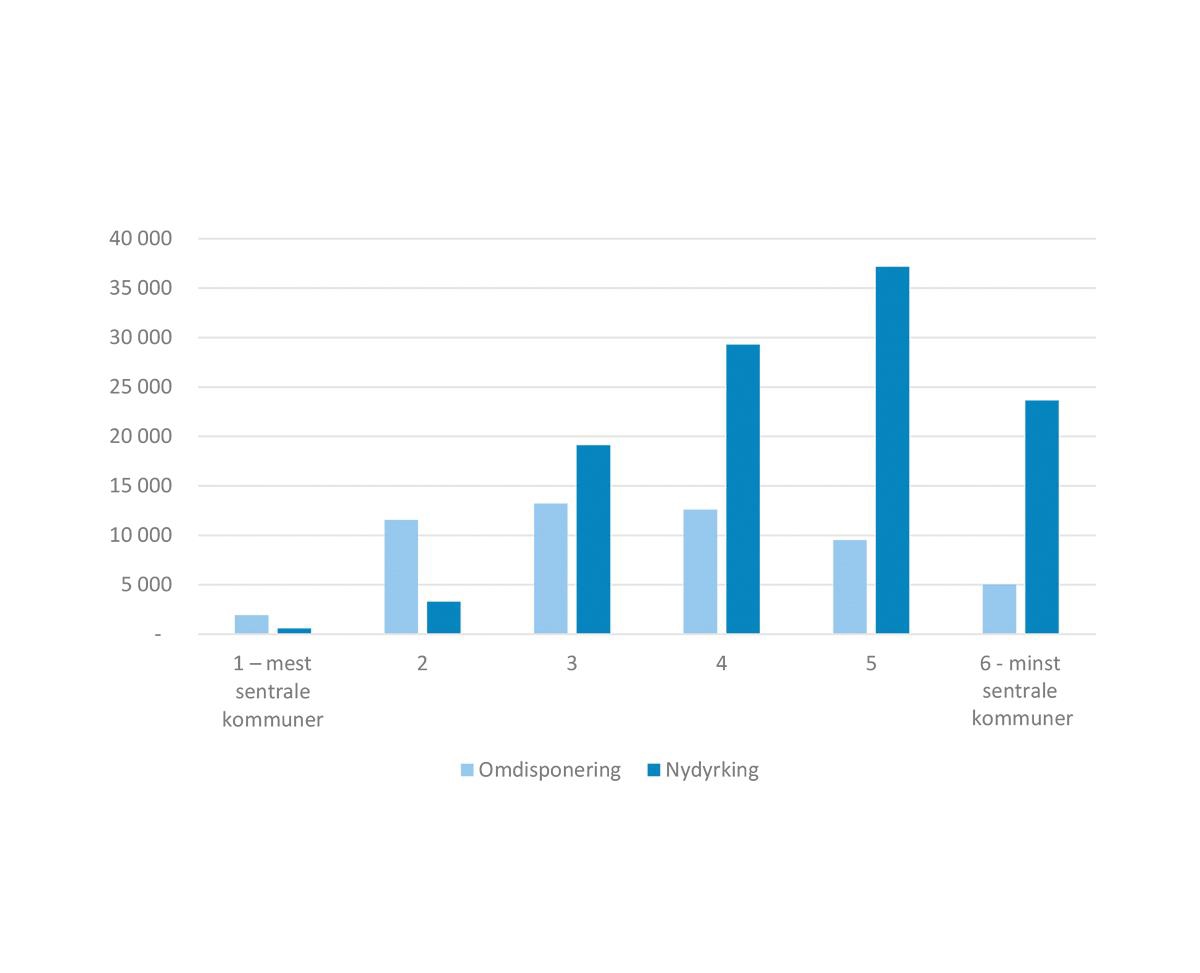 Figur 7.6 Omdisponering av dyrket og dyrkbar mark og godkjent nydyrket areal etter sentralitet (2015–2019). Tall i dekar.