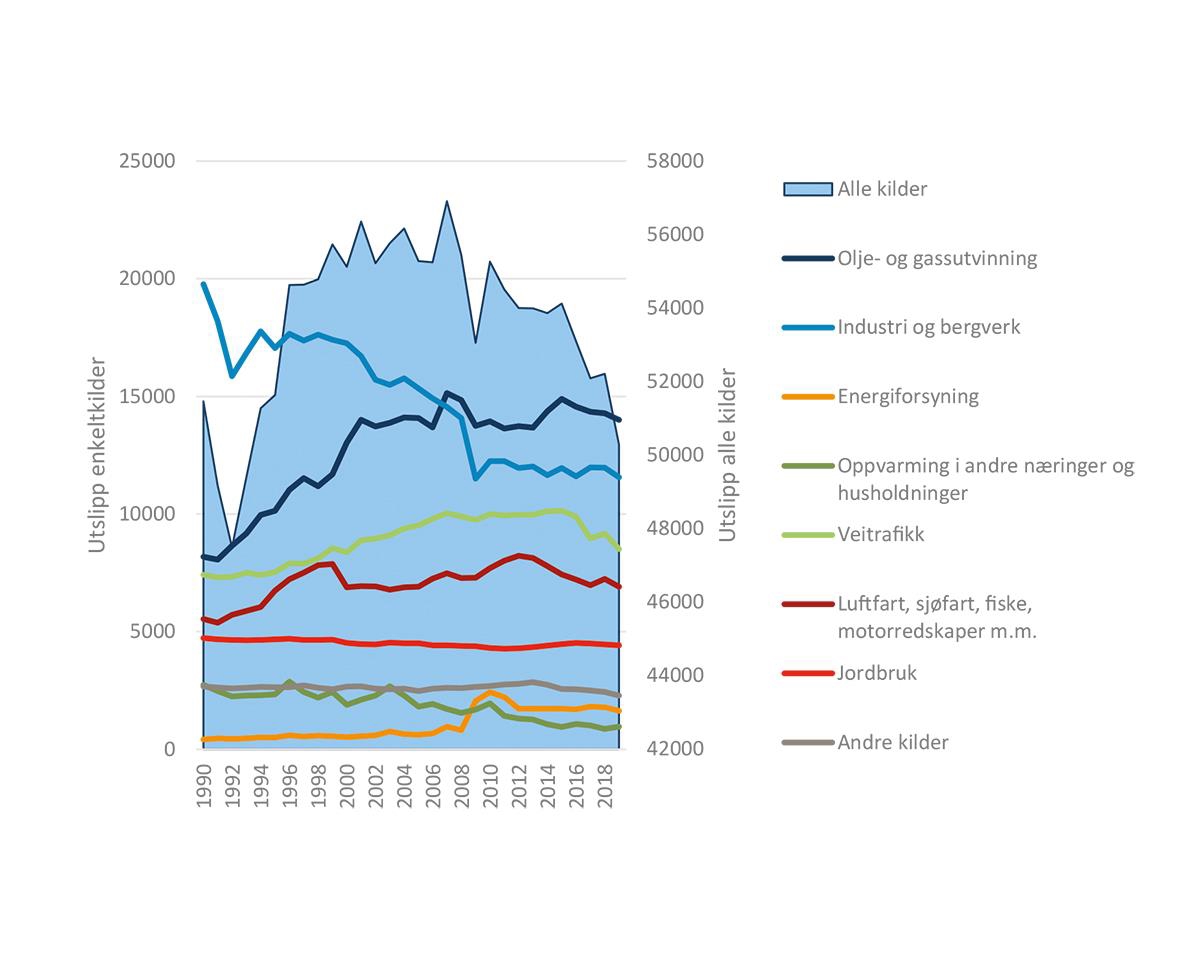 Boks 7.3 Nasjonale utslipp av klimagasserDe største kildene av klimagassutslipp i Norge er olje- og gassutvinning, industri og bergverk og veitrafikk. For offshorevirksomheten har utslippene stort sett økt i takt med produksjonen i hele perioden siden 1990. Innen industri og bergverk har ny teknologi og bedre prosesstyring gitt vesentlig lavere utslipp i samme periode. Vi må imidlertid tilbake til 2008 for å finne betydelige utslippskutt som skyldes omlegging til miljøteknologi. Mens veitrafikken målt i kjørelengder vokste med om lag 17 prosent mellom 2005 og 2016, økte klimagassutslippene med bare 7 prosent i samme periode. Dette henger først og fremst sammen med at man kjører lengre på samme mengden drivstoff, både fordi nye biler er mer drivstoffgjerrige og fordi stadig mer av trafikken foregår med dieselmotorer. Utslippene fra veitrafikken har gått nedover også de siste årene, og nedgangen i de totale utslippene fra 2018 til 2019 skyldes i stor grad dette, der salg av bensin og autodiesel gikk ned, samtidig som andelen biodrivstoff i drivstoffblandingen økte (SSB, 2020b). Figur 7.7 Innenlandske utslipp av klimagasser, etter kilde. Millioner tonn CO2-ekvivalenter.