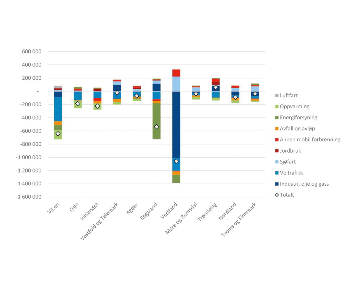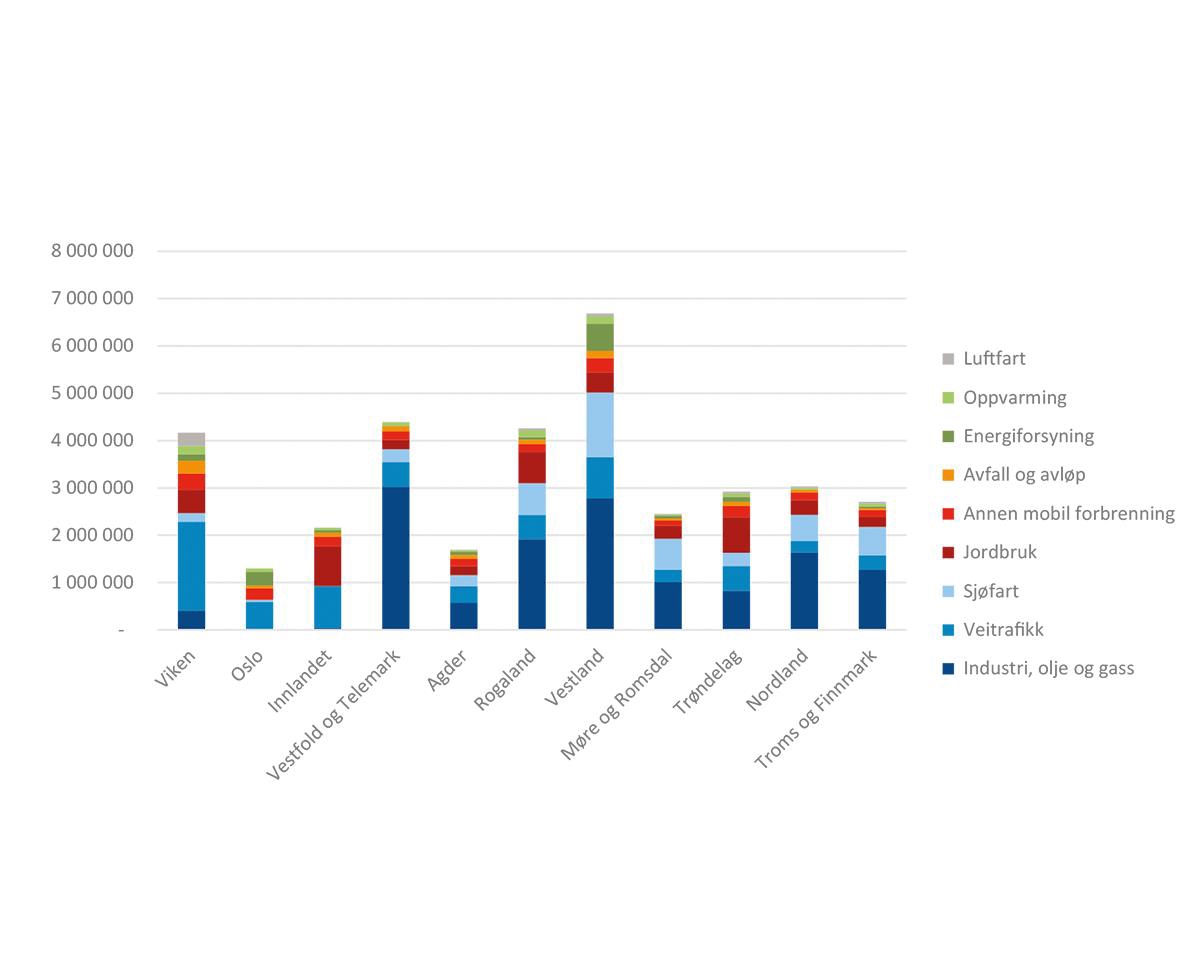 Industrien er den største utslippskilden i alle fylker unntatt Viken, Oslo og Innlandet, der det er veitrafikken som står for størstedelen av utslippene. Jordbruket utgjør en relativt stor del av utslippene i viktig landsbruksfylker som Innlandet, Trøndelag og Rogaland. Sjøfart har relativt store utslipp i kystfylkene på Vestlandet og i Nord-Norge.