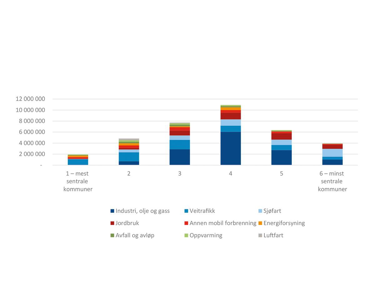 De store industriutslippene er konsentrert i små og mellomstore bykommuner med omlands- og småsenterkommuner på sentralitetsnivåene 3 til 5. Industri er likevel en av de største utslippskildene også i de minst sentrale kommunene, sammen med sjøfart og jordbruk. Veitrafikken er den største enkeltkilden til utslipp i de mest sentrale delene av landet, jf. figur 7.9. Kartet i figur 7.11 viser totale utslipp av klimagasser i 2019 i landets 159 bo- og arbeidsmarkedsregioner.