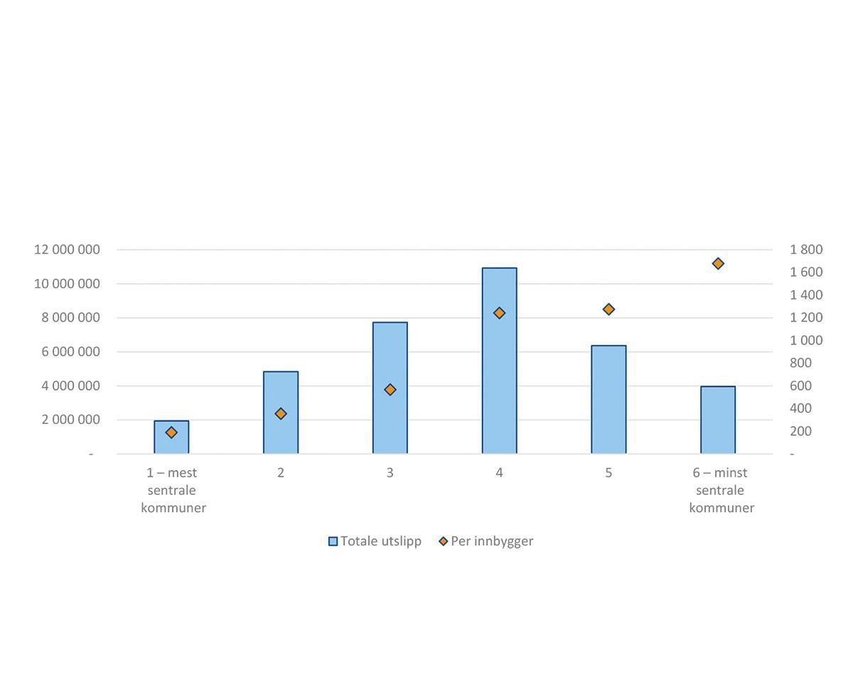 Figur 7.10 Utslipp av klimagasser etter sentralitet 2019. Tonn CO2-ekvivalenter totalt og per innbygger.