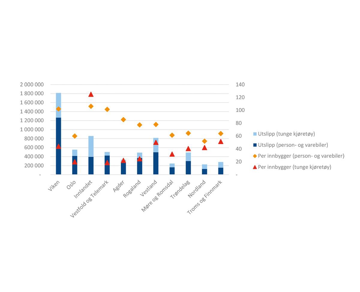 Oslo har lave utslipp per innbygger for person- og varebiler, og den klart høyeste kollektivandelen i landet bidrar til dette. De mulighetene en stor og tett bosatt befolkning gir for kollektivtransport i storbyregionene Bergen, Stavanger/Sandnes og Trondheim bidrar sannsynligvis også til at Rogaland, Vestland og Trøndelag har forholdsvis lave utslipp per innbygger fra person- og varebiler. Utslippene fra tunge kjøretøy er høyest i Viken og Innlandet. Dette kan ha sammenheng med at mye varetransport til andre deler av landet går igjennom disse fylkene. Utslippene per innbygger fra tunge kjøretøy er for eksempel svært høyt i Innlandet sammenlignet med andre fylker.