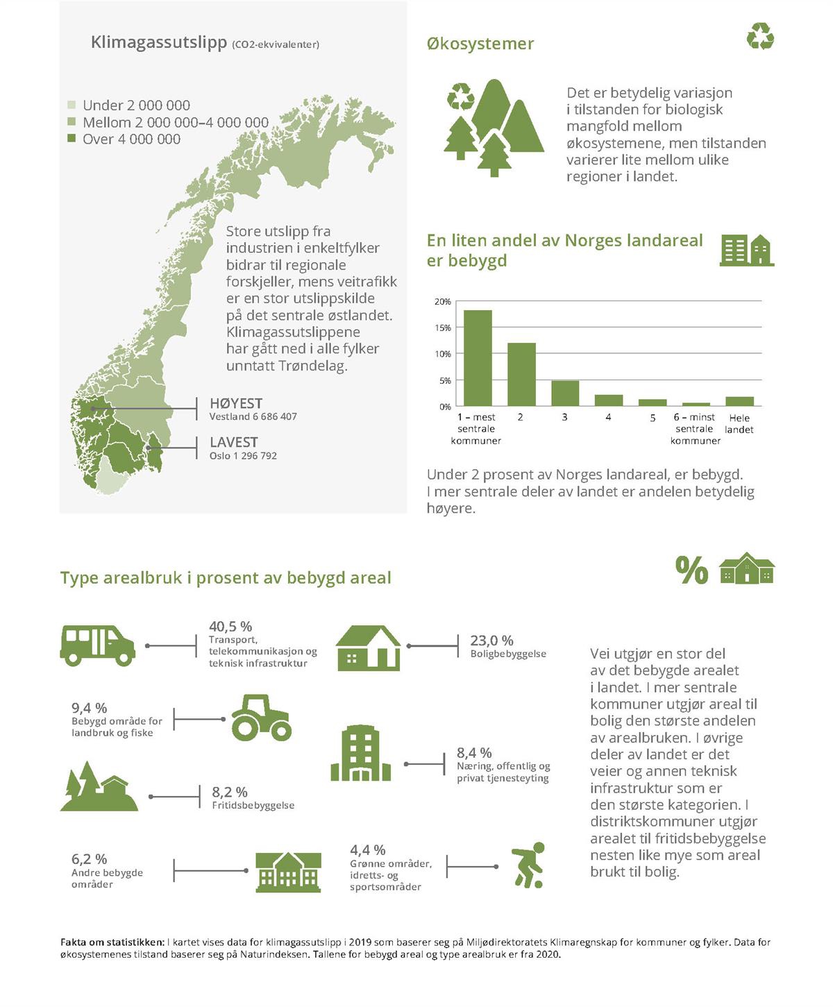 Omtrent 5500 kvadratkilometer, under 2 prosent av Norges landareal, er bebygd. Av det bebygde arealet dominerer veiareal med 38 prosent. Det er rundt 2100 kvadratkilometer veiareal i Norge. Dette tilsvarer nesten arealet til gamle Vestfold fylke. Boligbebyggelse utgjør 23 prosent av det bebygde arealet, mens fritidsbebyggelse dekker 8 prosent. Områder for næringsvirksomhet og tjenester og andre bebygde områder dekker 15 prosent, mens bebygde områder for landbruk og fiske utgjør 9 prosent.