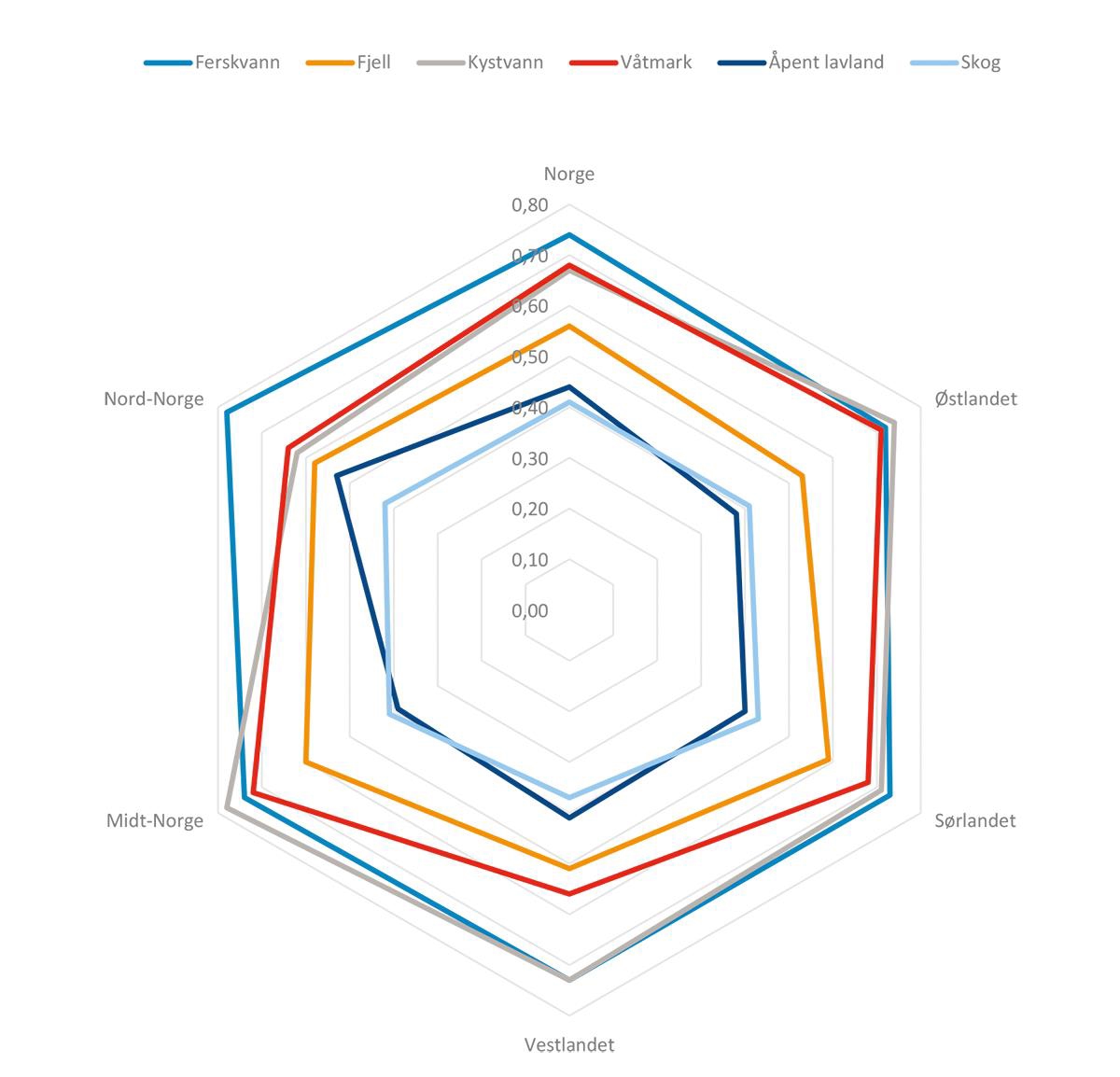 Naturindeksen viser betydelig variasjon i tilstanden for biologisk mangfold mellom økosystemene. Skog hadde i 2019 samlet sett den laveste indeksverdien (0,4127), etterfulgt av åpent lavland (0,44) og fjell (0,56). Våtmark, ferskvann og kystvann har høyere indeksverdier, som indikerer at tilstanden i disse økosystemene er noe bedre (henholdsvis 0,68, 0,74 og 0,67). Figur 7.1 viser naturindeksverdiene for økosystemene på land og kystvann på tvers av landsdeler i 2019. Vi kan se at i stort er variasjonen større mellom økosystemer enn mellom regioner innenfor hvert økosystem. Det er likevel enkelte forskjeller. Midt-Norge skiller seg for eksempel ut med høye verdier for kystvann og våtmark, men lav verdi for åpent lavland. Nord-Norge har på sin side de høyeste verdiene for åpent lavland, men også for ferskvann. Landsdelens indeksverdier for kystvann er imidlertid de laveste i landet.