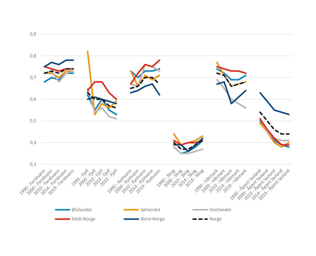 Tilstandsutviklingen varierer mellom økosystemene og til dels også mellom landsdelene. Dette illustreres i figur 7.2, som viser indeksverdier for alle hovedøkosystem i årene naturindeksen er utarbeidet for, på tvers av alle landsdeler.