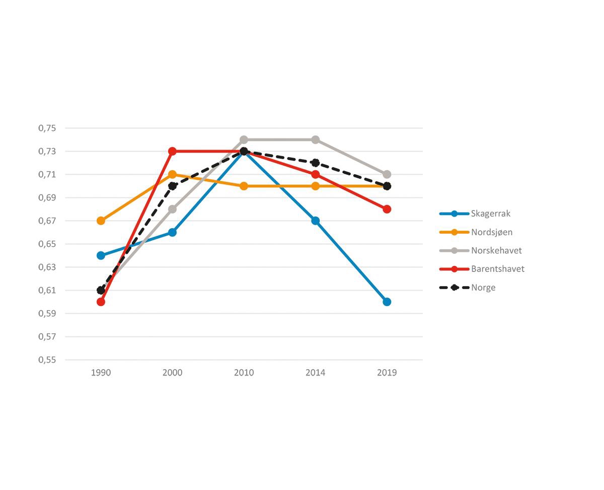 Figur 7.3 Naturindeks for økosystemet hav etter havområder 1990–2019.