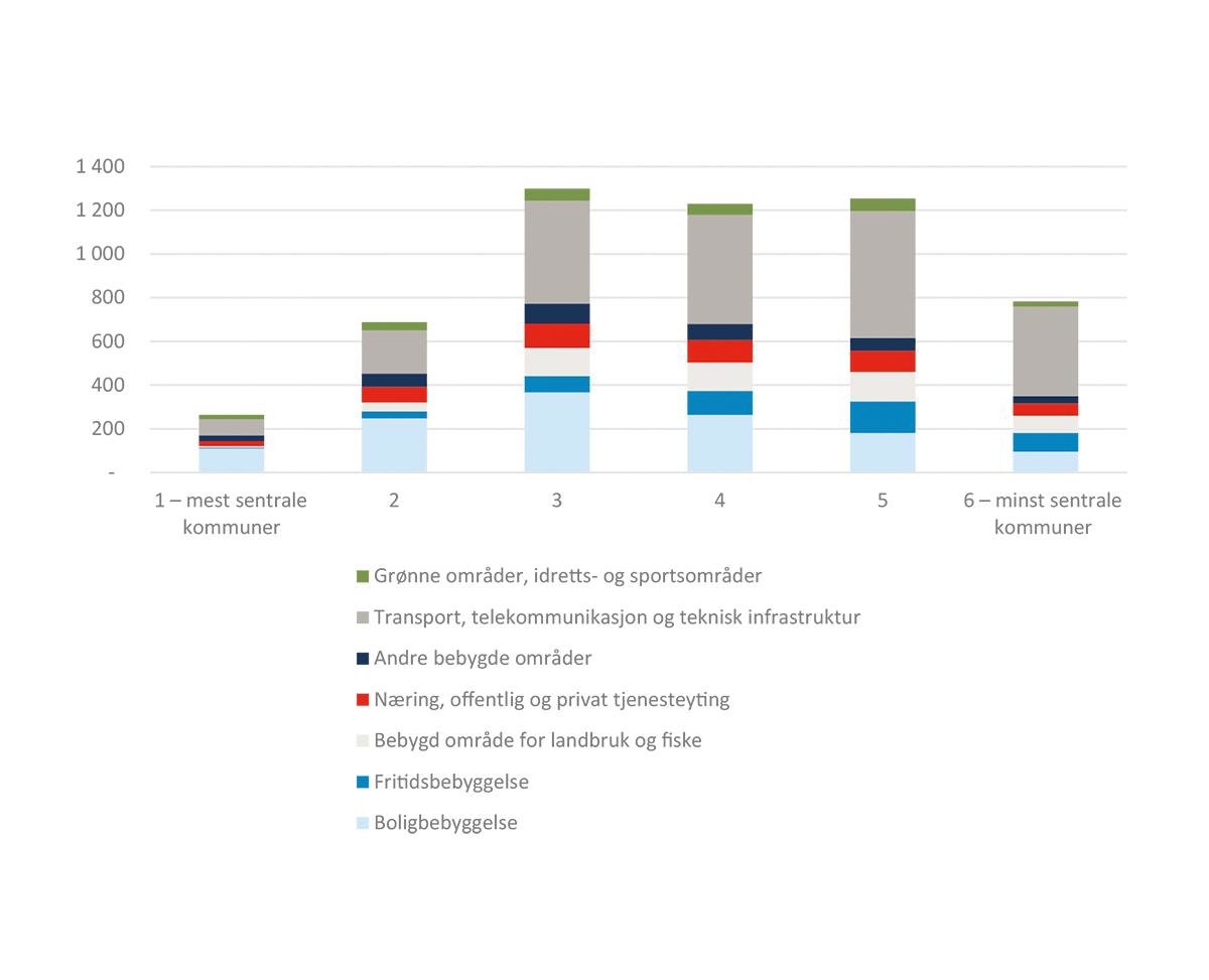 Figur 7.4 Bebygd areal etter sentralitet 2020. Tall i kvadratkilometer.