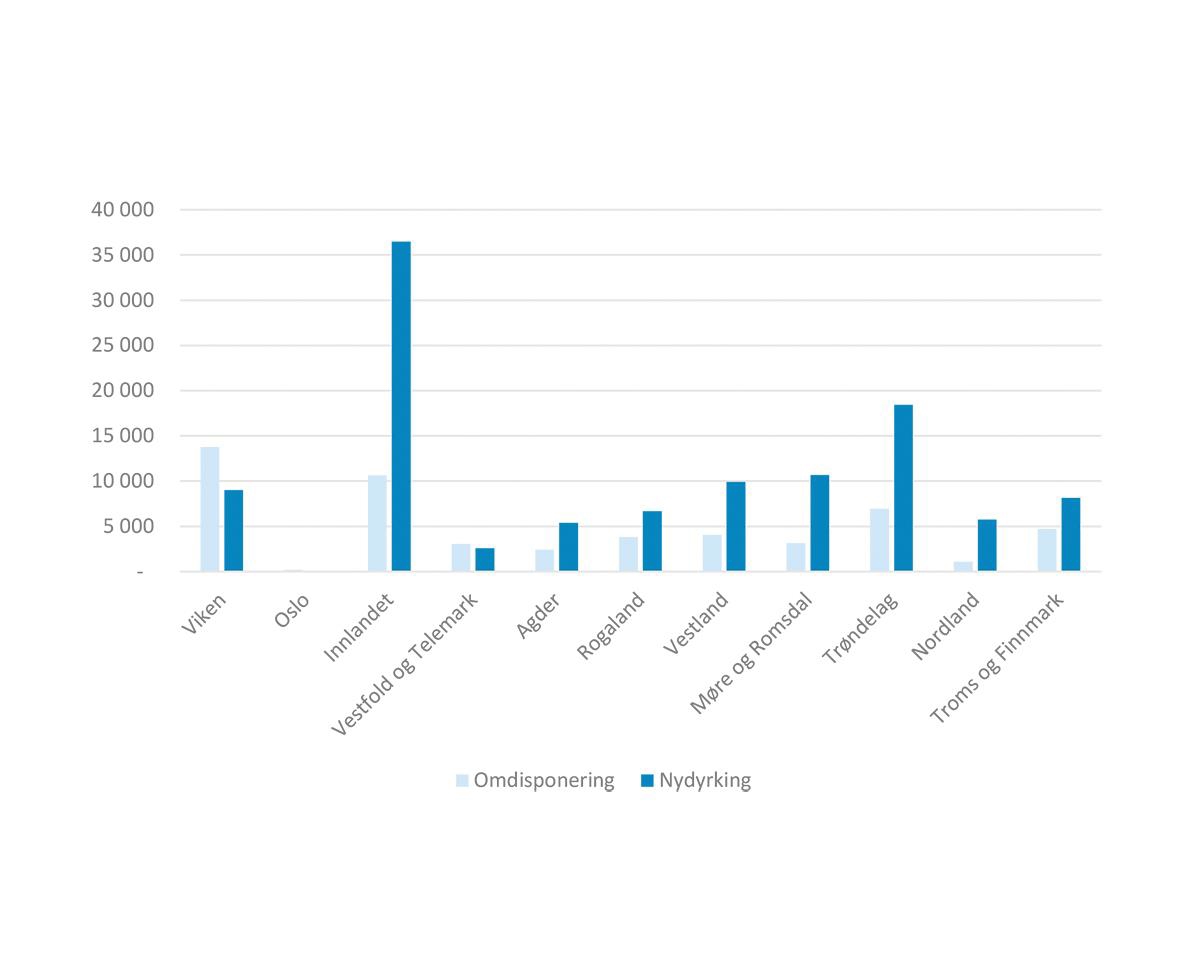 I perioden 2015–2019 ble det omdisponert 54 000 dekar dyrket eller dyrkbar mark. Samtidig ble det godkjent 113 000 dekar nydyrket areal, jf. figur 7.5. Det ble omdisponert mest areal i fylkene Viken og Innlandet. Innlandet er samtidig det fylket som har mest nydyrket areal. Der var nydyrkingen over tre ganger så høy som omdisponeringen av dyrket og dyrkbar mark. I fylkene Viken, Oslo, Vestfold og Telemark var omdisponeringen høyere enn nydyrkingen i perioden.