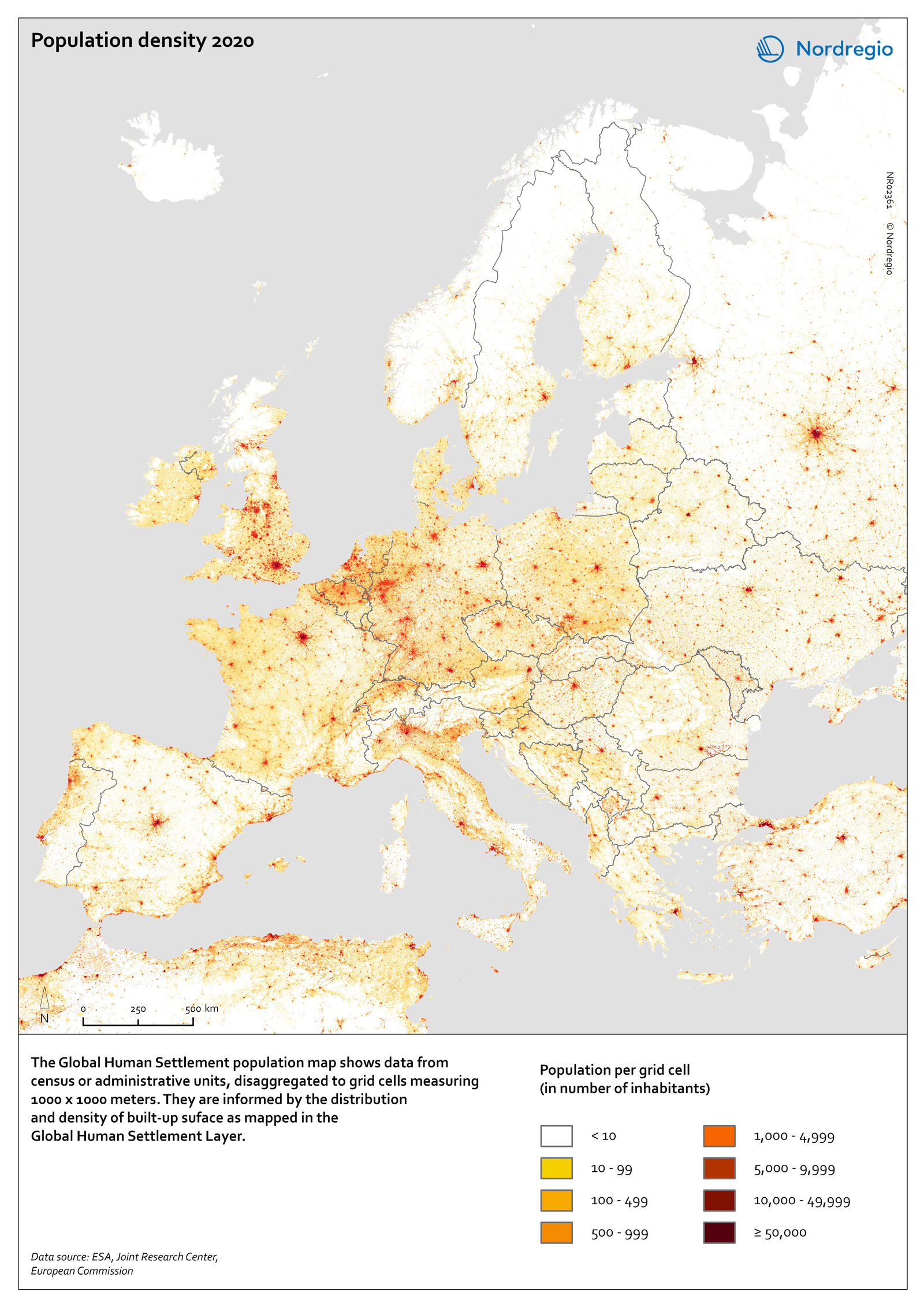 Figur 2.1 Befolkningstetthet i Europa 2020. Antall personer i celler på 1 km²