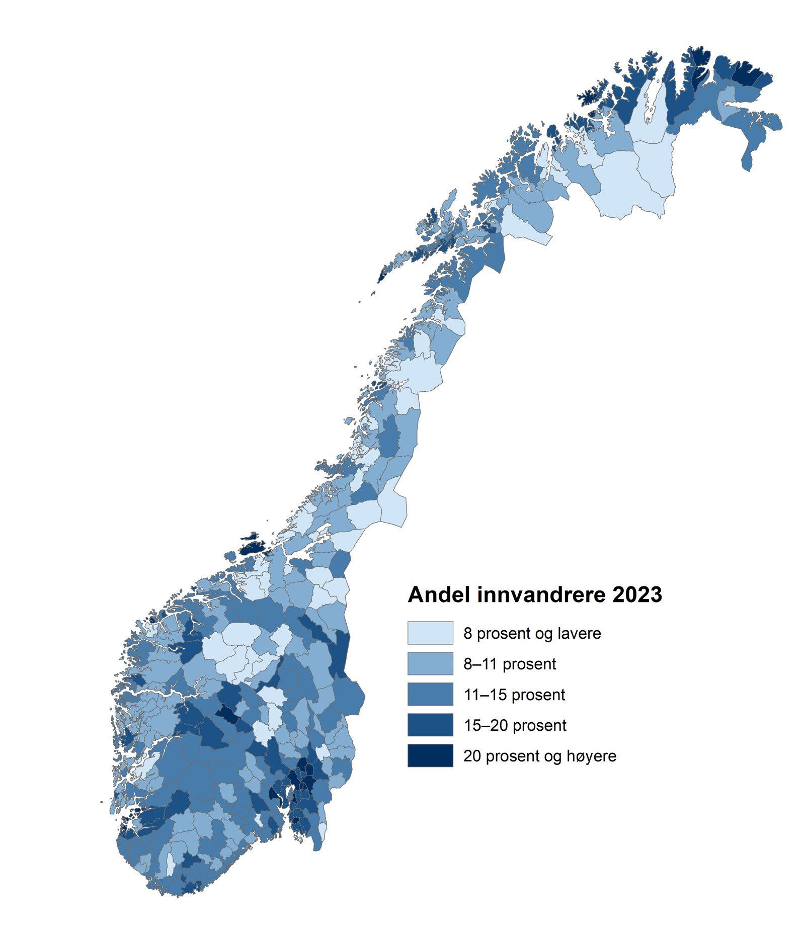 Figur 3.24 Andel innvandrere i kommuner. 2023. Prosent.