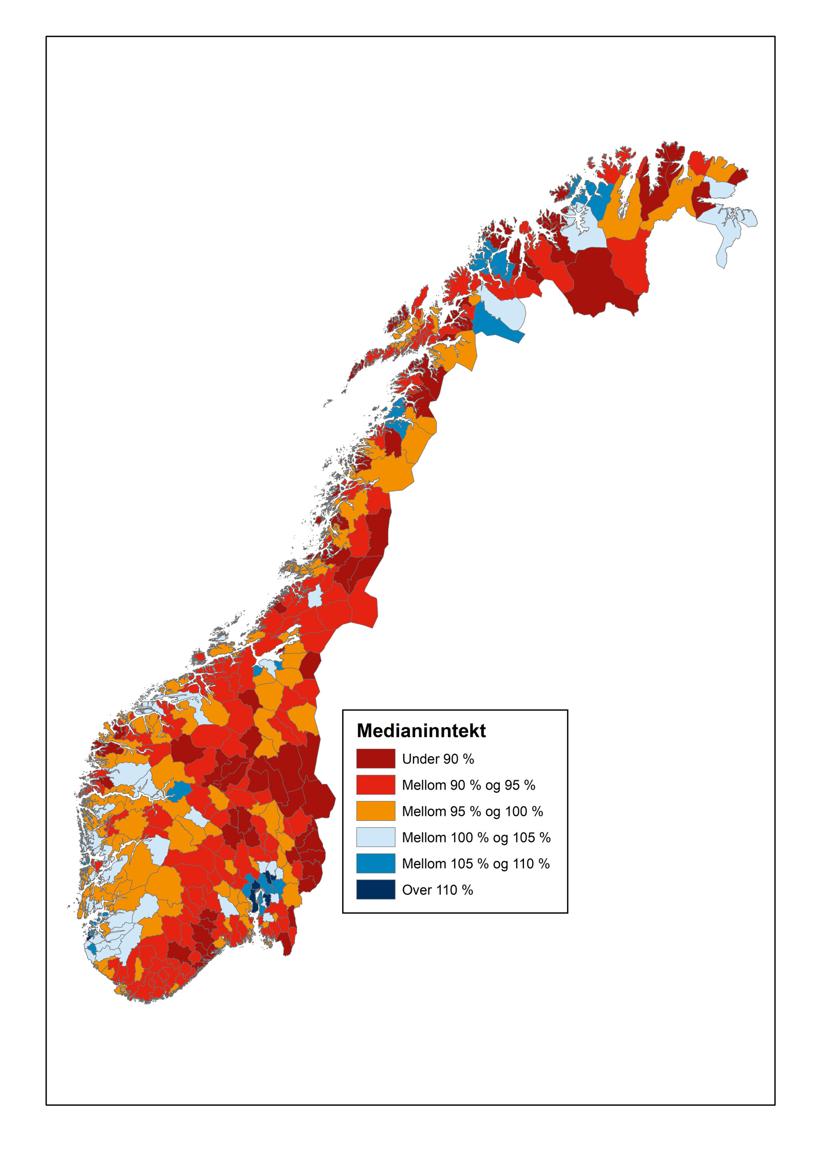 Figur 6.33 Brutto medianinntekt som avvik fra nasjonal medianinntekt etter kommune 2021. Prosent.