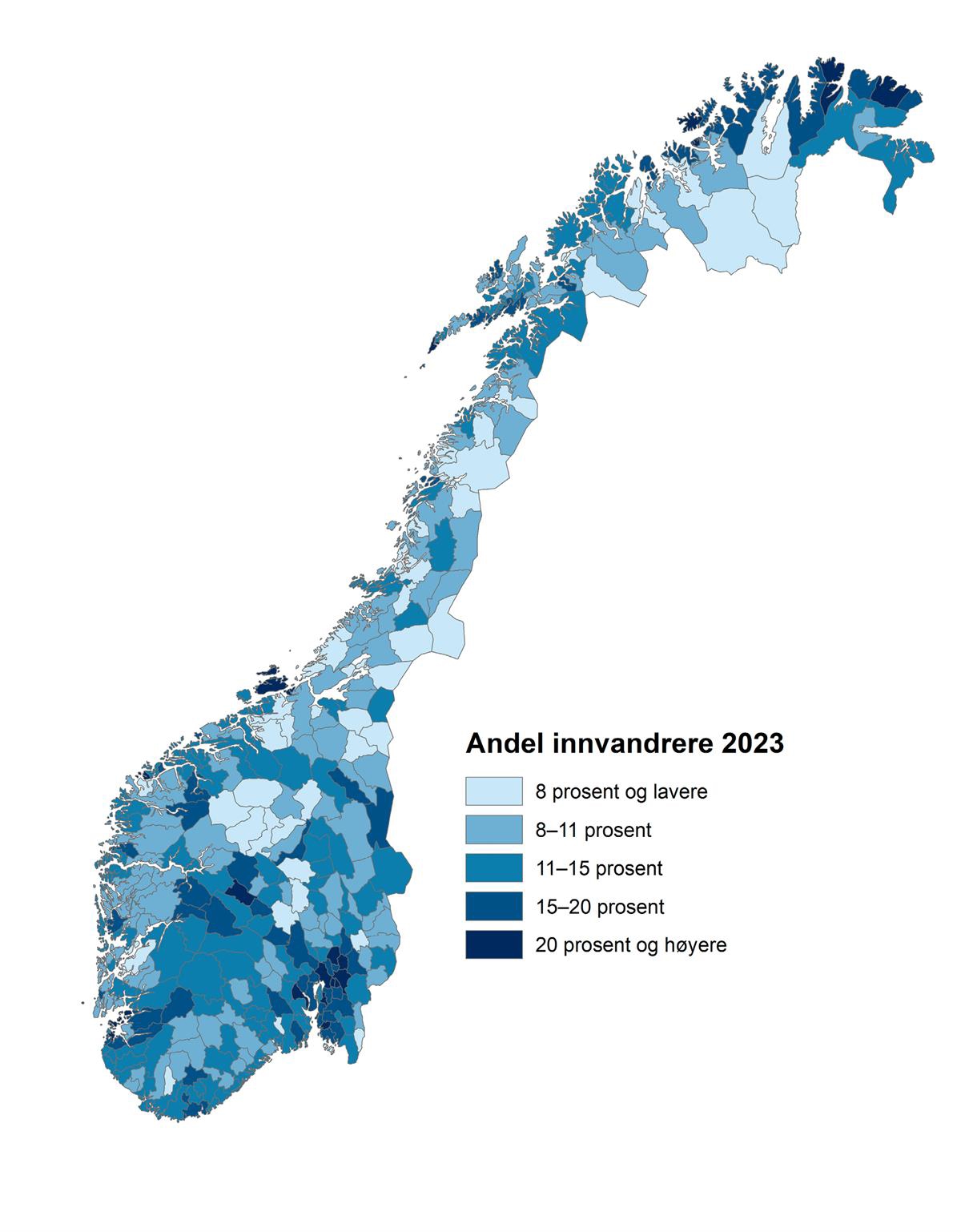 Det er store forskjeller mellom kommuner når det gjelder innvandrerandel, og kartet i figur 3.24 viser andelen innvandrere i kommunene ved inngangen til 2023. Noen distriktskommuner har passert Oslo i innvandrerandel, og Gamvik kommune i Finnmark har den høyeste andelen innvandrere av alle kommuner i landet (29 prosent). På de neste plassene følger Båtsfjord, Træna, Frøya, og Lørenskog, før Oslo som nå er nede på sjetteplass med 26 prosent innvandrere. Høy innvandrerandel i kystkommunene Gamvik, Båtsfjord, Træna og Frøya er knyttet til en stor andel arbeidsinnvandrere i fiskeindustrien. For noen av disse distriktskommunene har innvandrerandelen vokst kraftig de siste 20 årene, for eksempel i Træna der under 2 prosent var innvandrere i 2003, mot 27 prosent i 2023. Distriktskommuner preger også den andre enden av skalaen, og Rindal kommune i Trøndelag har lavest innvandrerandel (2,3 prosent) av alle kommuner, etterfulgt av Lom, Kåfjord, Nord-Odal og Snåsa.