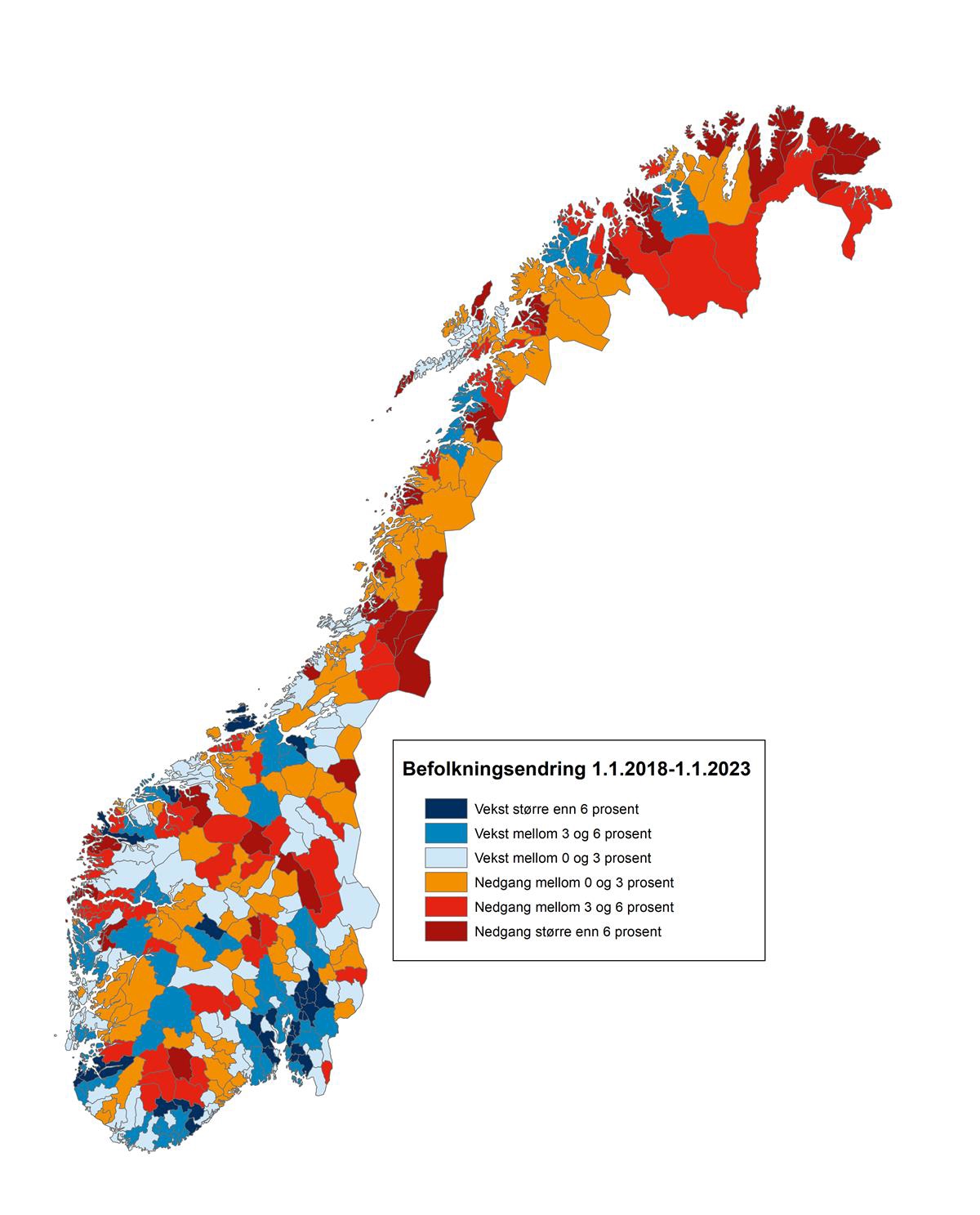 Figur 3.4 Befolkningsendring i kommuner (1.1.2018–1.1.2023). Prosent.