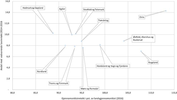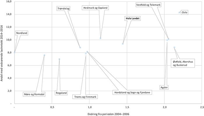 Andelen i Norge med vedvarende lavinntekt var på 9,4 prosent i perioden 2014–2016.17 Denne andelen var relativt stabil på om lag 8 prosent i Norge siden slutten av 1990-årene, men har økt til dagens drøyt 9 prosent det siste tiåret. Dette fremkommer tydelig i figur 5.1. Der ser vi fylkenes og landets andel med vedvarende lavinntekt i perioden 2014-2016 på den loddrette aksen, mens den horisontale aksen viser endringen i prosentpoeng fra perioden 2004-2006. Alle fylker unntatt Nordland har hatt en økning i andelen med vedvarende lavinntekt. Den overordnende tendensen på fylkesnivå er at den har økt mest der den var høyest fra før, jf. figur 5.1. I Nasjonalbudsjettet for 2018 vises det til at økningen i lavinntektsandelen fra 2009 bør ses i sammenheng med økt arbeidsledighet etter finanskrisen, høy arbeidsinnvandring, familiegjenforening og mange nye asylsøkere. Det vises videre til at blant personer med flyktningbakgrunn har mer enn fire av ti vedvarende lavinntekt (Meld. St. 1 2017–2018).