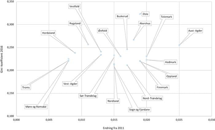 Det er relativt små regionale forskjeller i de norske fylkenes Gini-koeffisienter. Figur 5.4 viser Gini-koeffisientverdien for de norske fylkene – før de kommende endringene i regionstrukturen – for året 2016, samt endringen i verdien sammenlignet med 2011. Det er i hovedsak Oslo som skiller seg ut med en verdi på over 0,3. Dette er ikke overraskende, gitt fylkets høye andel med vedvarende lavinntekt, kombinert med en høy gjennomsnittsinntekt (se neste avsnitt). Det er likevel flere fylker som har hatt en større økning. Aust-Agder, Innlandsfylkene, Telemark og Finnmark har alle opplevd en større økning i inntektsforskjellene enn Oslo.