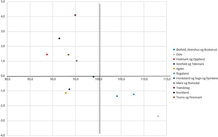 I Norge i tidsperioden 2006–2016 ser vi spor av mulige agglomerasjonsulemper i landets store og mellomstore byregioner, jf. figur 5.6. Mesteparten av de største byområdene, herunder Oslo, Stavanger, Bergen og Tromsø bo- og arbeidsmarkedsregioner, skiller seg for eksempel ut ved å ha en gjennomsnittsinntekt over landsgjennomsnittet sammen med en negativ utvikling sett opp mot landet sett under ett.