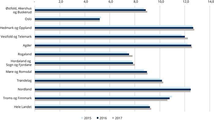 Østfold, Akershus og Buskerud | 8,4 | 9,0 | 8,7 | 9,1 | 9,0 | 11,7 | 8,8 |