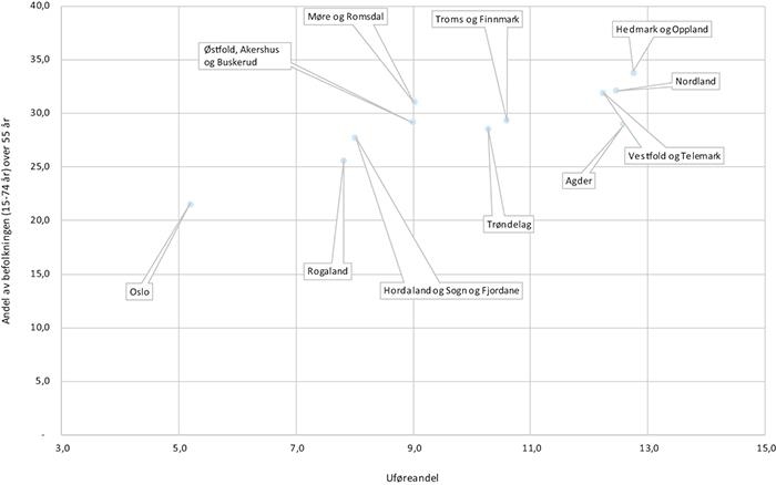 Fylker som Hedmark og Oppland, Vestfold og Telemark, og Nordland har alle en høy andel av befolkningen over 55 år. Det er også disse fylkene, sammen med Agder, som skiller seg ut med de høyeste uføreandelene. På den andre siden har Oslo, Rogaland og Hordaland og Sogn og Fjordane lavest andeler av både uføre og eldre. Samvariasjonen er også tydelig og signifikant på kommunenivå.