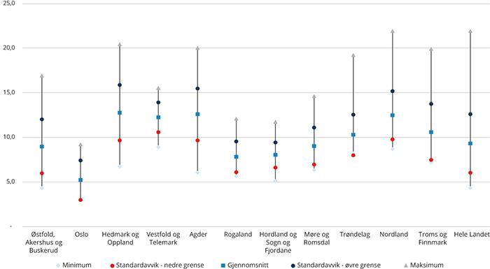 Vestfold og Telemark | 9,9 | 9,8 | 11,6 | 10,3 | 8,6 | 10,0 | |