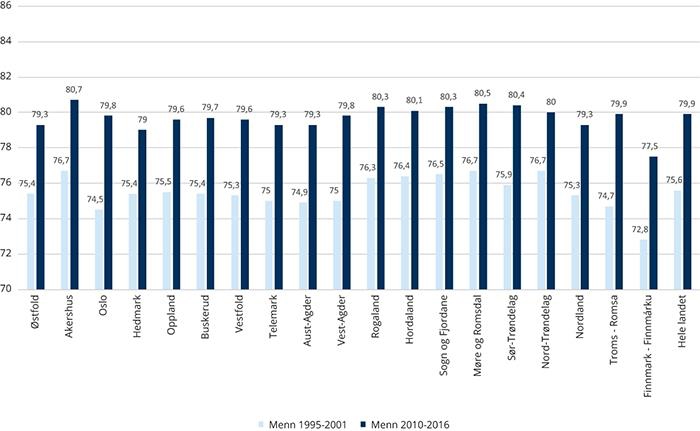 Figur 5.12 Forventet levealder ved fødselen 1995-2001 og 2010-2016 for menn. Fylker.