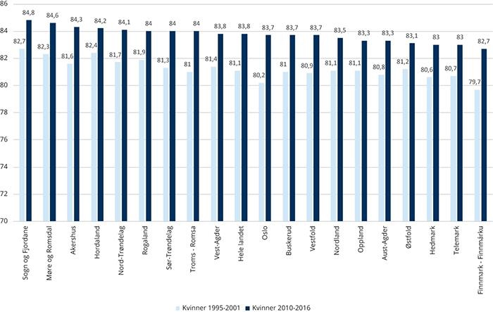 Forskjellene i levealder mellom fylkene for kvinner har holdt seg ganske stabil over tid, men det har skjedd endringer mellom fylkene siden slutten av 1990-tallet. Oslo (3,5 år), Troms (3,0 år) og Finnmark (3,0 år) har hatt den sterkeste veksten i forventet levealder, mens Hordaland (1,8 år), Østfold (1,9 år) og Rogaland og Sogn og Fjordane (2,1 år) har hatt den svakeste veksten.