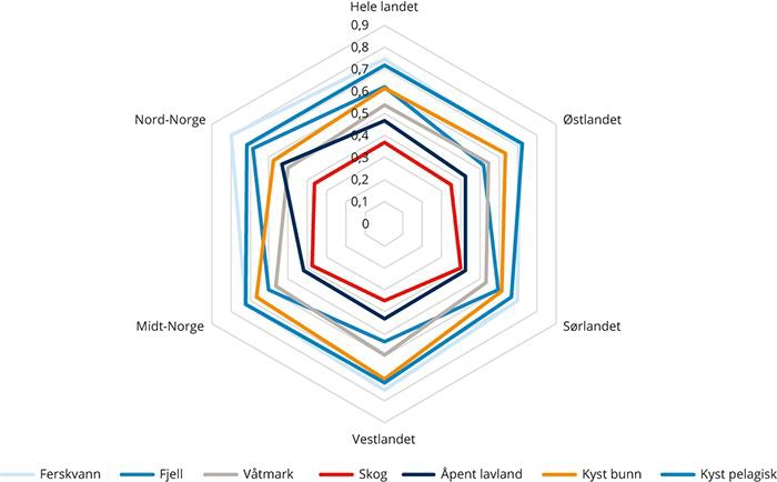 For ferskvann er tilstanden generelt god, men noe dårligere på Sørlandet og deler av Vestlandet på grunn av omfattende og langvarig forsuring (figur 7.2). Omfattende skogbruk over lang tid har bidratt til lave forekomster av nøkkelindikatorer som gamle trær og død ved. Naturindeksen for skog viser svak oppgang siden 1990, men fortsatt lav verdi. Utviklingen over tid illustrerer at endringene i skogen i Norge skjer langsomt. Naturindeksen for fjell har variert en god del, men er nå litt lavere enn i 1990. Dette gjelder for landet som helhet, men mer i sør enn i nord. Variasjon i smågnagerbestanden bidrar mye til variasjonen i indeksen over tid, mens fjellrype og lirype bidrar sterkt til nedgangen.