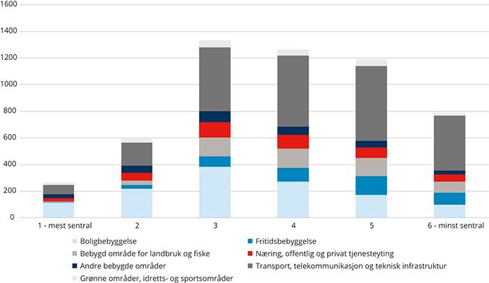 Også for arealbruk er det geografiske forskjeller. I absolutte tall er bebygd areal størst på sentralitet 3, som også har flest innbyggere. Arealbruken er lavest på sentralitet 1 og 2. Dette er dermed områder med den høyeste tettheten. Dette gir seg utslag i hvor stor andel av det bebygde arealet som brukes til ulike formål. På sentralitet 1 og 2 utgjør areal til bolig den største andelen med hhv. 44 og 37 prosent. På øvrige sentralitetsnivåer er det veier og annen teknisk infrastruktur som er den største kategorien og varierer fra 36 prosent på sentralitet 3 til 52 prosent på sentralitet 6. På sentralitet 5 og 6 utgjør arealet til fritidsbebyggelse 11 prosent av det bebygde arealet, noe som er nesten like mye areal brukt til bolig (hhv. 15 og 13 prosent).
