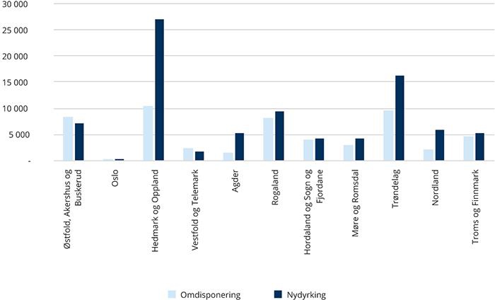I perioden 2012-2016 ble det omdisponert 54 000 dekar dyrket eller dyrkbar mark. Samtidig ble det godkjent 86 000 dekar nydyrket areal. I fylkene Hedmark og Oppland og Trøndelag ble mest areal omdisponert. Dette var samtidig fylkene der det var mest nydyrket areal. I Hedmark og Oppland var nydyrkingen nesten tre ganger så høy som omdisponeringen av dyrket og dyrkbar mark. Østfold, Akershus og Buskerud var også blant fylkene med mest omdisponert areal, men her var nydyrkingen mer beskjeden. Sammen med Vestfold og Telemark var dette fylker der nydyrkingen var lavere enn omdisponeringen.