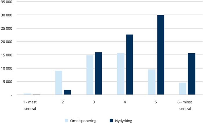 Det er særlig de høyt produktive landbruksområdene nær byer og tettsteder som er utsatt for utbyggingspress. Mest omdisponering skjedde på sentralitetsnivåene 3 og 4, som utgjør små- og mellomstore byer, samt omlandskommuner til større byer. Figur 7.5 viser også at nydyrkingen i større grad foregår i mindre sentrale kommuner.