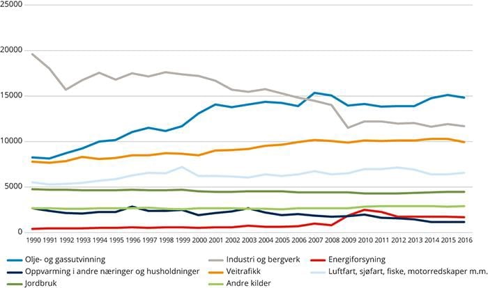 Kilder for utslipp av innenlandske klimagassutslipp De største kildene av klimagassutslipp i Norge er olje- og gassutvinning, industri og bergverk og veitrafikk. For offshorevirksomheten har utslippene stort sett økt i takt med produksjonen i hele perioden siden 1990. Innen industri og bergverk har ny teknologi og bedre prosesstyring gitt vesentlig lavere utslipp i samme periode. Vi må imidlertid tilbake til 2008 for å finne betydelige utslippskutt som skyldes omlegging til miljøteknologi. Mens veitrafikken målt i kjørelengder har vokst med om lag 17 prosent siden 2005, så økte klimagassutslippene med bare 7 prosent i samme periode. Det skyldes først og fremst at vi nå kjører lengre på samme mengden drivstoff, både fordi nye biler er mer drivstoffgjerrige og fordi stadig mer av trafikken foregår med dieselmotorer. Figur 7.6 Innenlandske utslipp av klimagasser, etter kilde. Millioner tonn CO2-ekvivalenter.