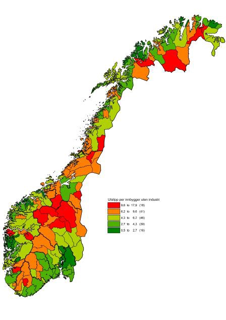 Fylkesfordelte og kommunefordelte utslipp av klimagasser SSB presenterte for første gang i 2014 fylkesfordelte tall for utslipp av klimagasser. Her inngår de aller fleste utlippskildene i Norge, men med noen viktige unntak: offshore, luftrom og havområder, som det ikke gir mening å plassere i et fylke.1 Totalt er 65 prosent av de rapporterte utslippene på nasjonalt nivå fylkesfordelt. SSB har også kommunefordelt utslipp fra følgende kilder: Utslipp fra veitrafikk, oppvarming, jordbruk, avfallsdeponigass, annen avfall- og avløpsrensing og motorredskaper gjelder alle kommuner. Dette utgjør om lag 35 prosent av alle utslipp.2 Utslippene fra veitrafikk fylkesfordeles ut fra trafikktellinger og er dermed beheftet med noe usikkerhet. Disse tellingene fanger ikke opp drivstofftype i bilene. Den effekten bruk av elbiler har på utslippene, vil dermed bli fordelt til alle fylker etter hvordan trafikk med lette kjøretøy er fordelt og ikke etter hvor elbiler brukes i størst grad. 1 I tillegg er noen utslippskilder utelatt fordi en mangler god nok informasjon for å kunne plassere utslippene regionalt. Det gjelder skipstrafikk langs kysten, bruk av produkter mv. 2For kommuner over 20 000 innbyggere gir SSB tall for utslipp fra industri og bergverk, olje- og gassutvinning – landanlegg og energiforsyning, slått sammen i en kilde. Dette er ikke tatt med i analysene i denne rapporten. |