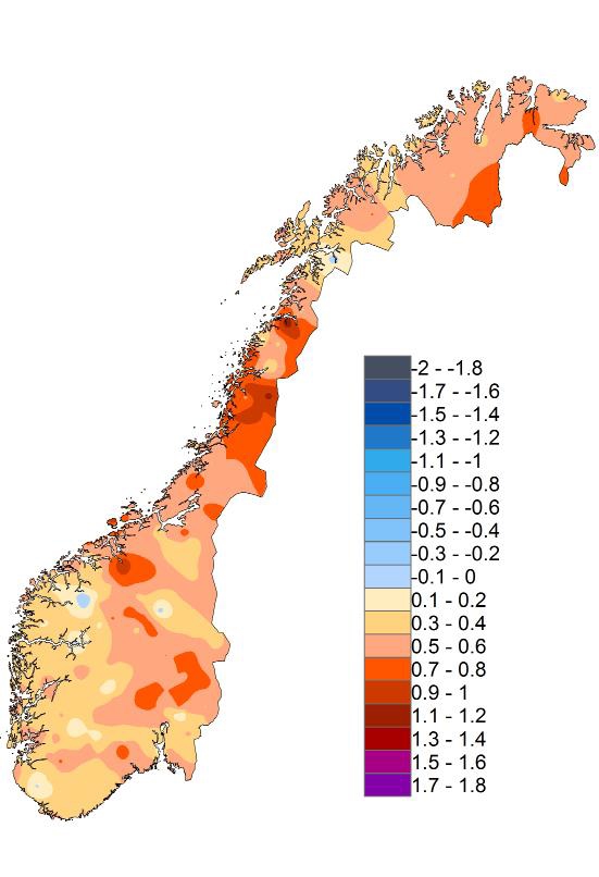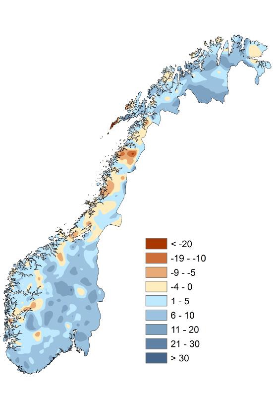 Figur 7.10 Temperaturavvik for perioden 1985-2014 sammenlignet med 1971-2000. Prosent.