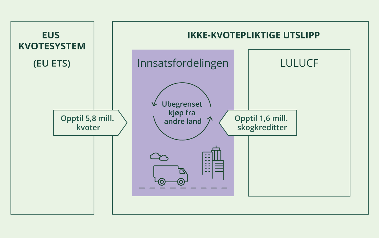 - De kan overføre kvoter fra kvotesystemet (ETS). Adgangen til fleksibilitet fra ETS gjelder bare noen få land og er kvantitativt begrenset. For Norge er adgangen om lag 5,8 millioner tonn gjennom hele perioden. Disse kvotene kan kun benyttes til å dekke underskudd i den norske forpliktelsen. Kvotene kan i praksis brukes til å dekke et underskudd både under innsatsfordelingen og skog- og arealbrukssektoren.
