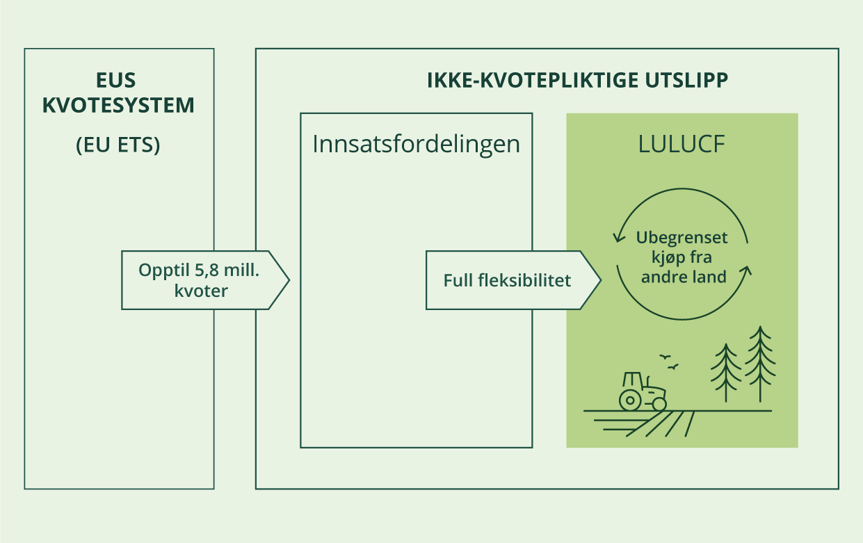 - De kan overføre kvoter fra kvotesystemet (ETS). De 5,8 millioner kvotene fra kvotesystemet som Norge har adgang til gjennom ETS kan også brukes til å dekke et underskudd i forpliktelsene under skog- og arealbruksregelverket. Dette skjer ved at Norge overfører utslippsenheter fra innsatsfordelingen til skog- og arealbruksregelverket og tetter hullet som dermed oppstår i innsatsfordelingen, gjennom bruk av kvoter fra kvotesystemet.