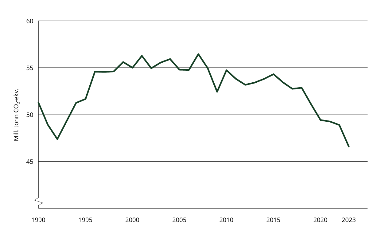 De norske utslippene av klimagasser var i 2023 på 46,6 millioner tonn CO2-ekvivalenter utenom skog- og arealbrukssektoren, ifølge foreløpige tall fra SSB. Endelige tall for 2023 blir publisert i november.