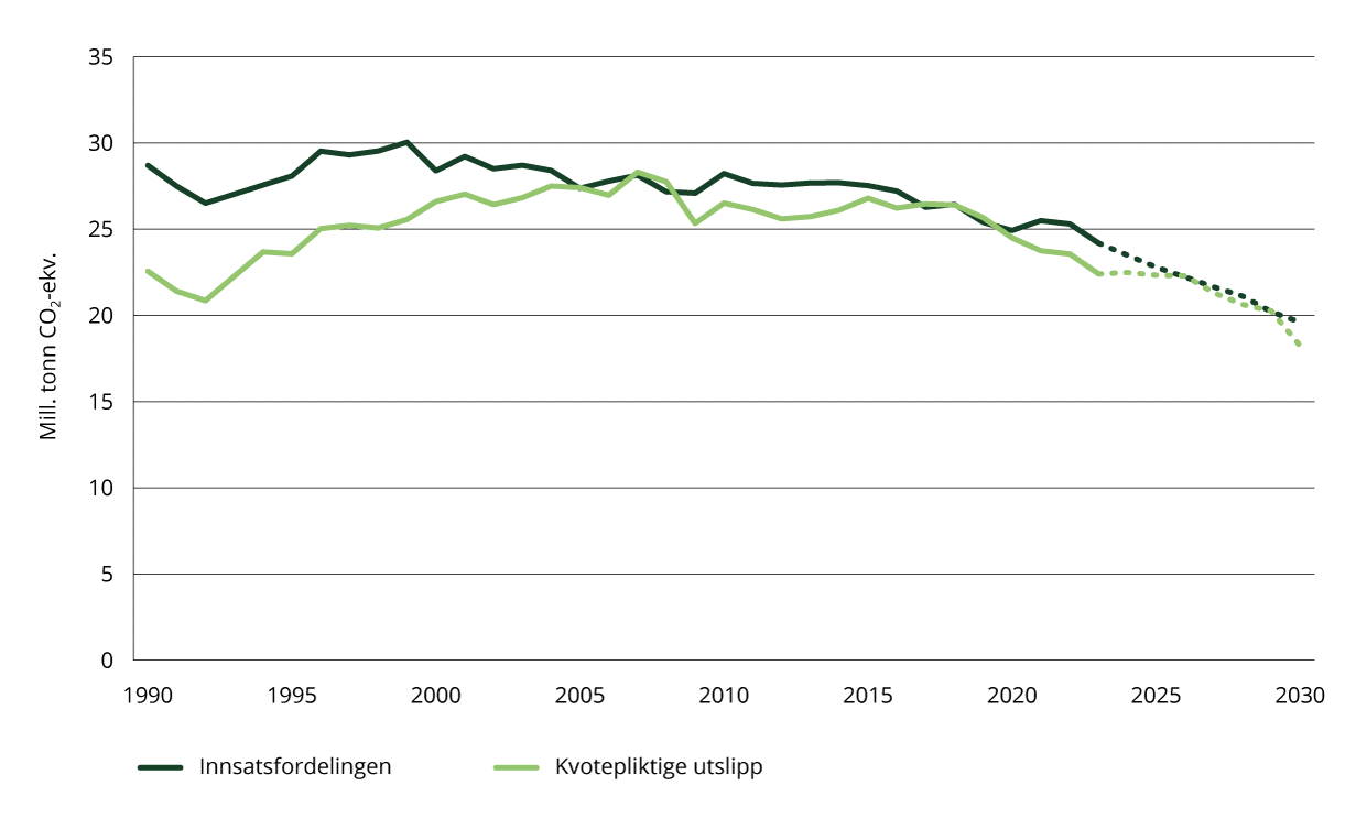 Figur 4.2 viser historiske utslipp fra 1990 og fremskrevne utslipp til 2030, fordelt på utslipp under innsatsfordelingen og kvotepliktige utslipp. I tillegg kommer utslipp og opptak fra skog- og arealbrukssektoren. Fremskrivingen viser at nedgangen i utslippene forsetter, og i 2030 anslås utslippene av klimagasser til 37,8 millioner tonn CO2-ekvivalenter. Det er reduksjon på 8,8 millioner tonn CO2-ekvivalenter fra de foreløpige utslippstallene for 2023. Av utslippsreduksjonen er godt over halvparten forventet å komme i innsatsfordelingen, hvor utslippene er anslått å gå ned med i underkant av 5 millioner tonn fra 2023 til 2030. Kvotepliktige utslipp er beregnet å gå ned med i underkant av 4 millioner tonn i den samme perioden. Anslagene er usikre.
