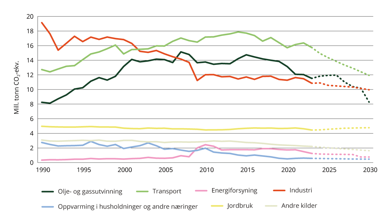 Figur 4.3 viser utviklingen i Norges utslipp siden 1990, og hvordan de er ventet å utvikle seg framover gitt forutsetninger om økonomiske forhold og med en videreføring av dagens politikk og virkemidler (fremskrivingene) i de ulike sektorene. Det har vært store endringer i de ulike sektorene selv om utslippene i Norge samlet sett har vært relativt stabile siden 1990. Det har blant annet vært en stor reduksjon i utslippene fra industri, mens utslippene fra transport og olje- og gassutvinning har økt siden 1990, selv om de har avtatt de siste 10 årene.