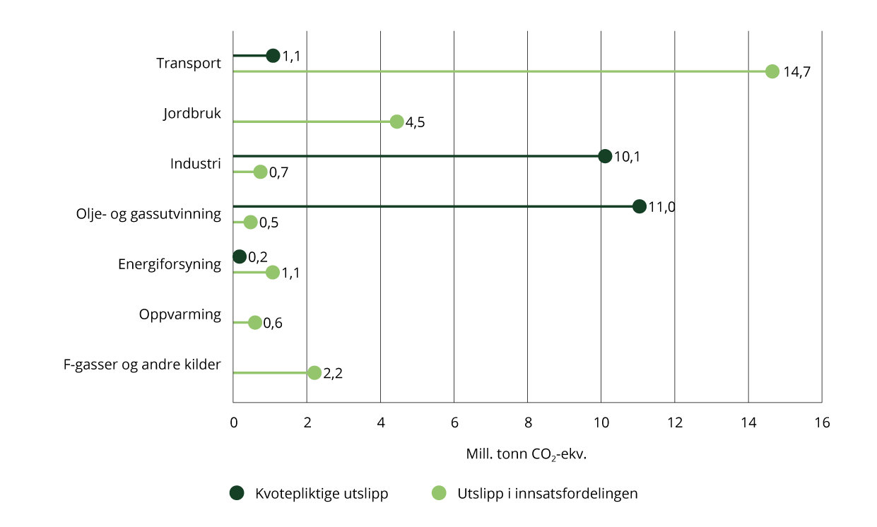 Figur 4.4 viser fordelingen av utslipp i 2023 mellom kvotepliktige og utslipp under innsatsfordelingen per sektor. Omtrent halvparten av de norske klimagassutslippene er kvotepliktige, noe som innebærer at de er omfattet av kvotesystemet til EU (EU ETS). Se nærmere omtale i kapittel 2.2.2. Industrien, petroleumsnæringen og luftfarten står for den største delen av disse utslippene. I energiforsyning er under halvparten av utslippene kvotepliktige.