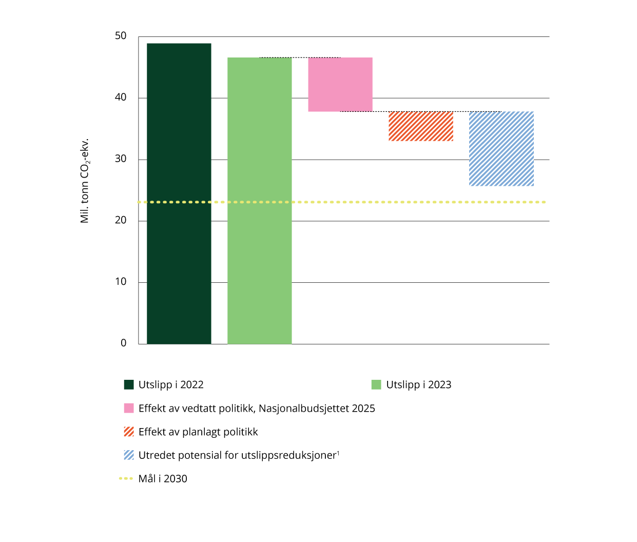 Figur 4.8 viser forventede utslippsreduksjoner og utredet potensial for utslippsreduksjoner mot 2030. Foreløpige utslippstall for 2023 viser at utslippene dette året var 46,6 millioner tonn CO2-ekvivalenter (lysegrønn søyle i figuren). Det er ventet at utslippene vil gå videre ned. Utslippsfremskrivingene viser at med en videreføring av allerede vedtatt politikk (rosa søyle i figuren) er utslippene i 2030 ventet å være om lag 19 prosent lavere enn i 2023 og 26 prosent lavere enn i 1990. Disse overslagene er usikre.