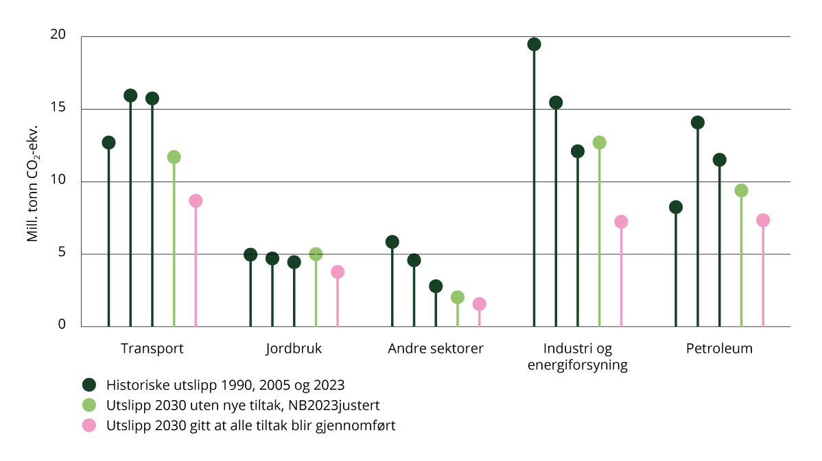 Grafen nedenfor illustrerer historiske utslipp og utslipp i 2030 i hver sektor dersom alle tiltakene som er utredet, blir gjennomført. Tiltaksanalysene er ikke en fullstendig liste over alle mulige klimatiltak, og det kan være teknisk mulig å oppnå større utslippsreduksjoner enn det som er utredet.
