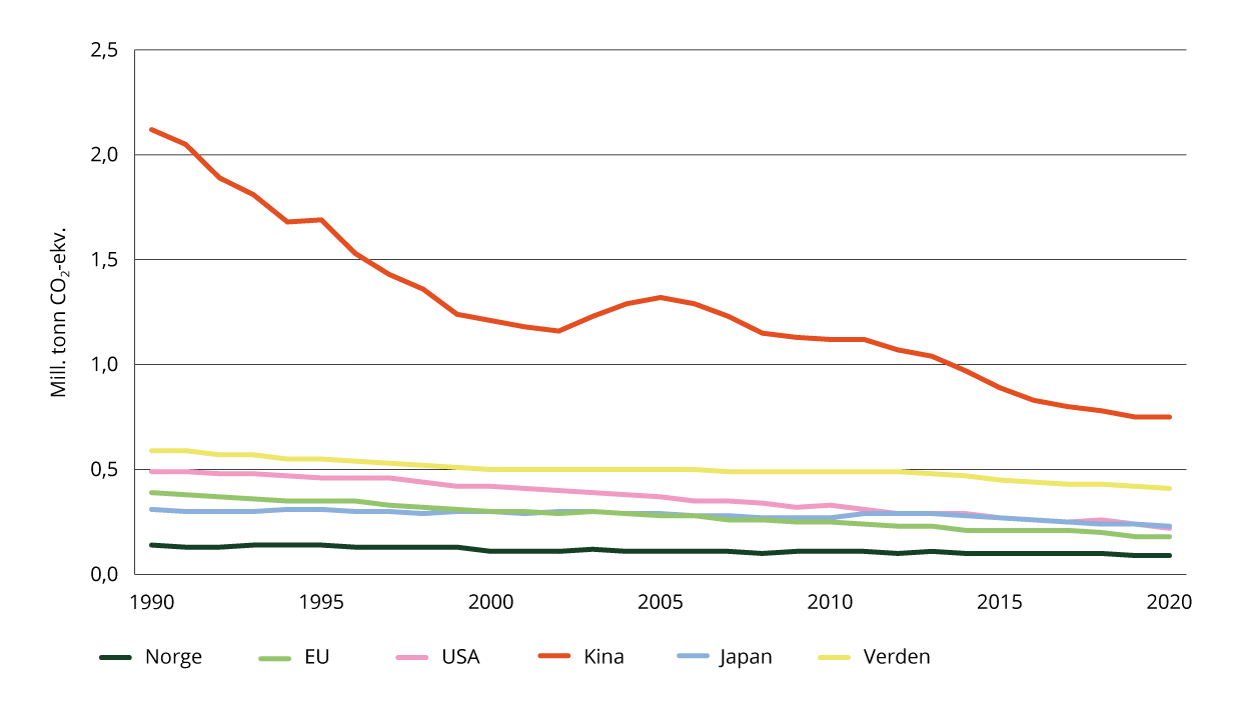 Kilde: Statistisk sentralbyrå (09298 Utslippsintensitet fra norsk økonomisk aktivitet)